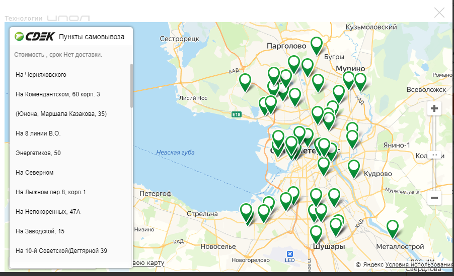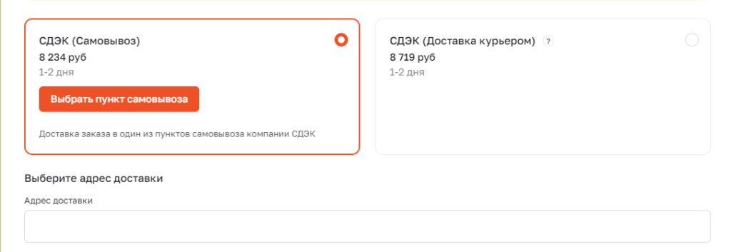 3. В форме «Доставка» выберите «СДЕК (самовывоз) или СДЕК (курьер)»: