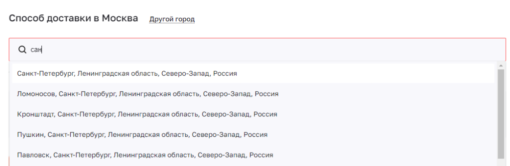 1. В форме «способ доставки» укажите город доставки из выпадающего списка:
